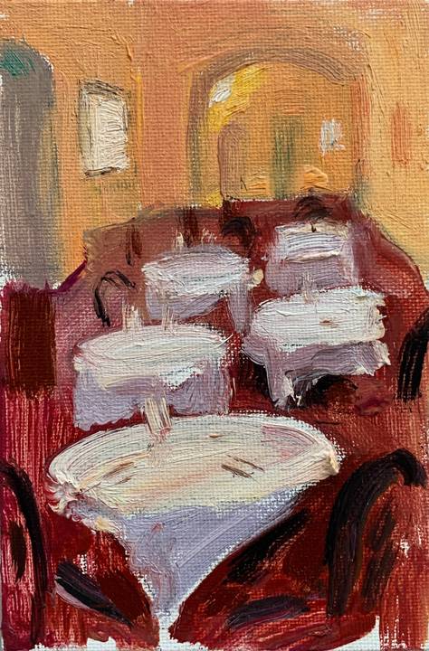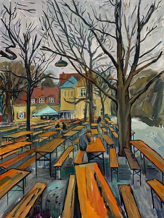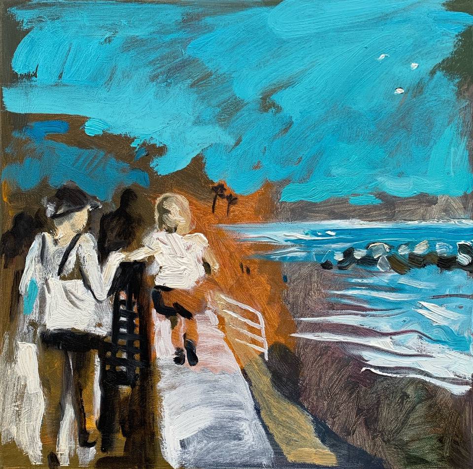 В этой серии я пишу волны, прибрежные кафе и людей, которые никуда не спешат. В каждом сюжете есть что-то очень простое и уютное: солнце на воде, тени от зонтов, тихие разговоры за столиками. Эти моменты хочется сохранить на холсте, чтобы к ним можно было вернуться в любое время.