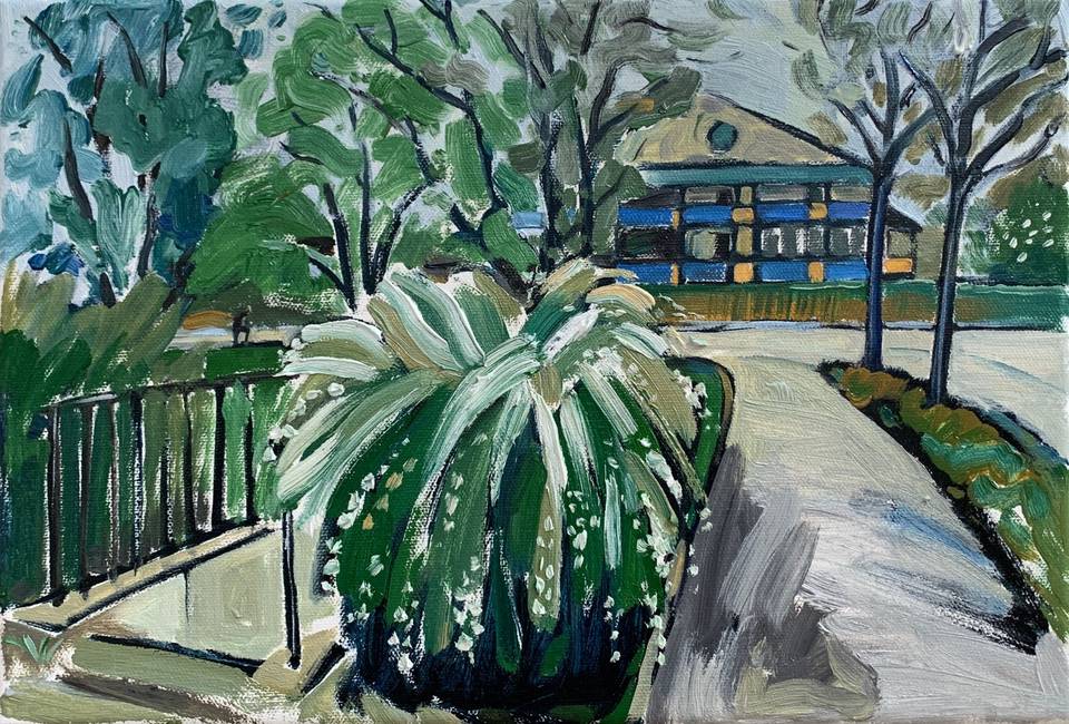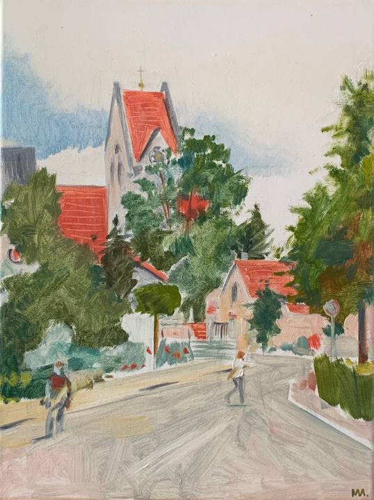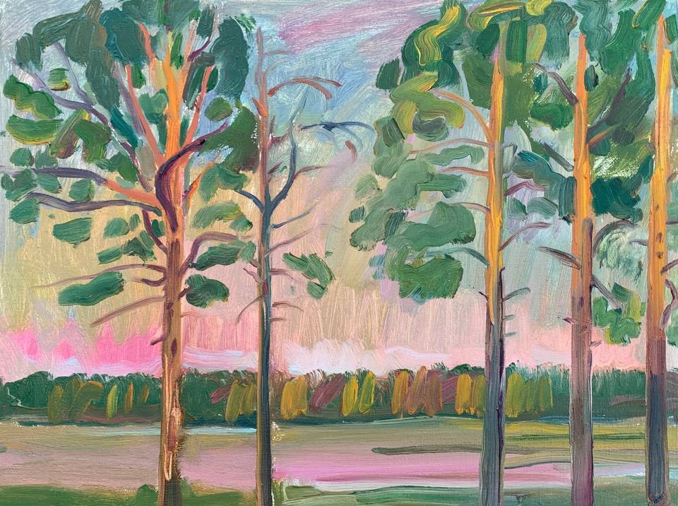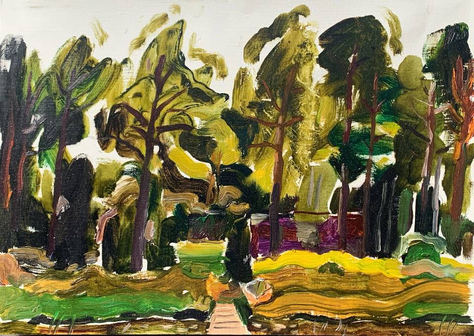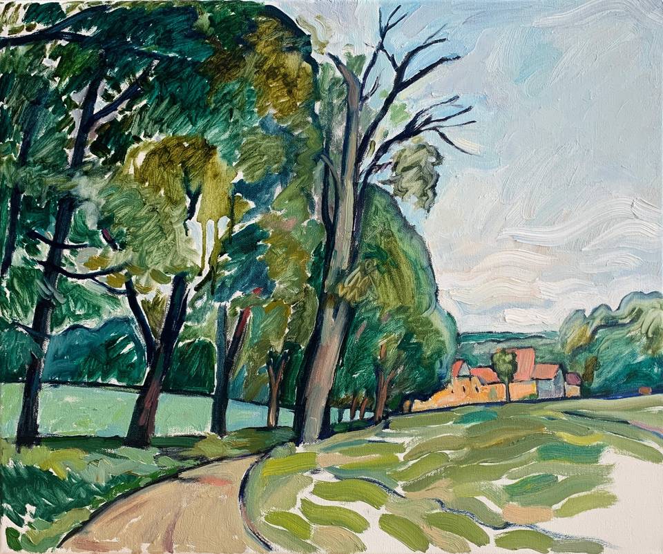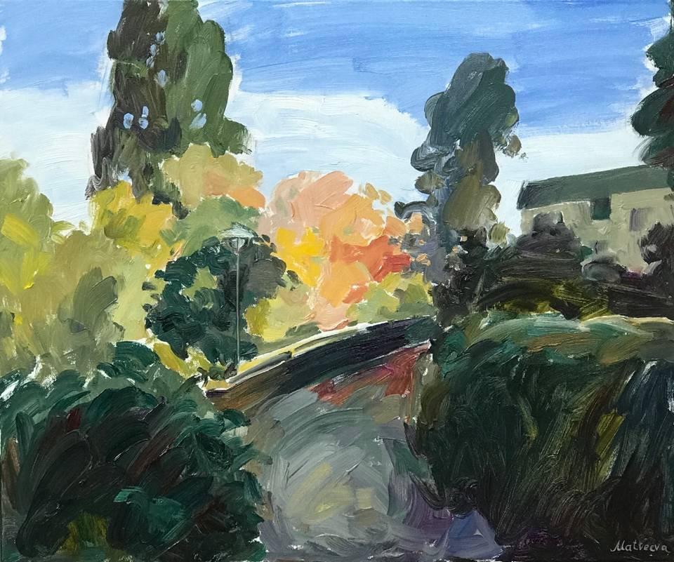 В своих пригородных пейзажах я стараюсь показать именно эту близость: небольшие дома не доминируют, а спокойно существуют среди зелени. Простые дорожки, скамейки и ровные посадки лишь намекают на присутствие человека, но не нарушают природного ритма. Для меня это пространство на границе — место, где город уже заканчивается, а природа начинает говорить по-настоящему.